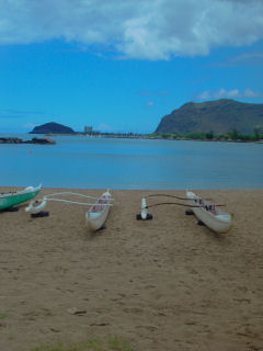 Comments: Hawaiian paddling canoes rest on the beach at